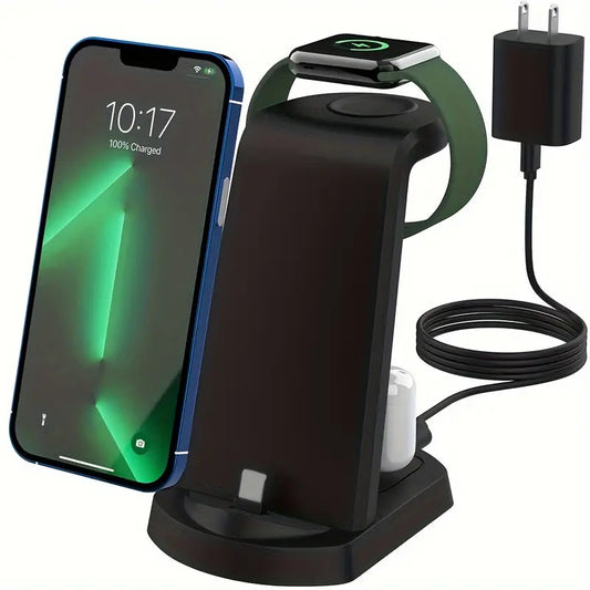 3-in-1 Wireless Charging Station, 15W Fast Wireless Charger Stand, Wireless Charging with QC3.0 Adapter for iPhone 15, 14, 13, 12, 11/Pro/Max/Mini/Plus, X, XR, XS/Max, SE, 8/Plus, for iWatch 1-9, for Airpods 3/2/Pro